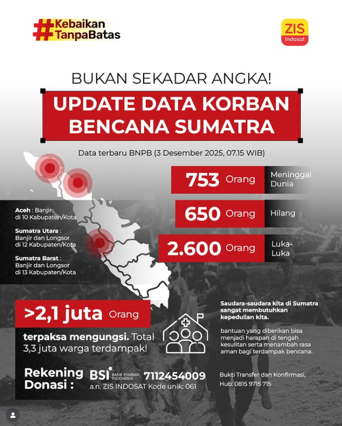Seluruh rangkaian kegiatan ini merupakan bagian dari komitmen ZIS Indosat yang ditutup dengan seruan, “Nantikan kami di Sumatra. #KebaikanTanpaBatas”.